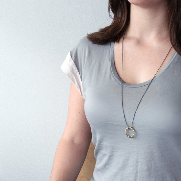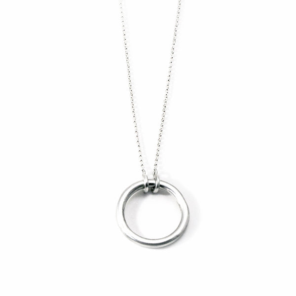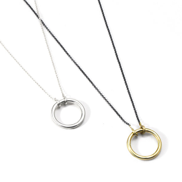 This beautifully simplistic ring necklace is the perfect transitional accessory. Can easily work for a day of running errands, the office or a night out. Available in your choice of material on a 24" rolo chain with lobster clasp.